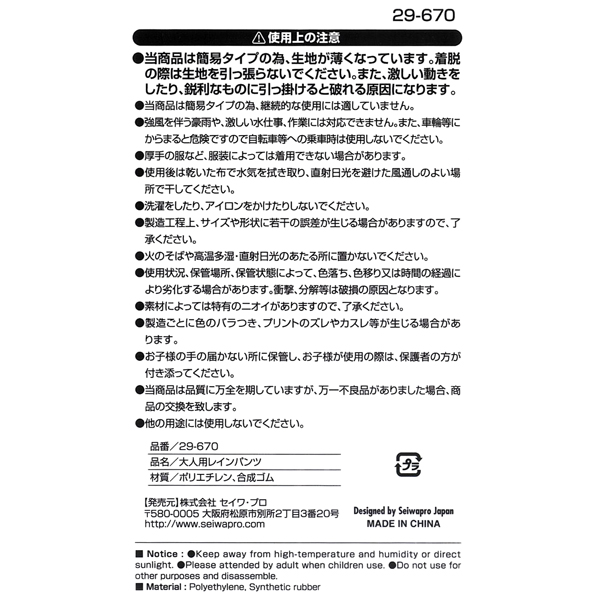 大人用レインパンツ