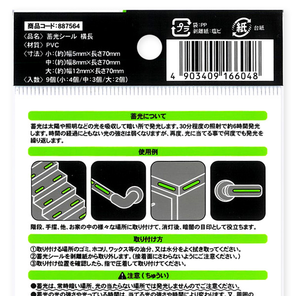 階段、手摺など様々な場所に取り付けて、消灯後、暗闇の目印として役立ちます。