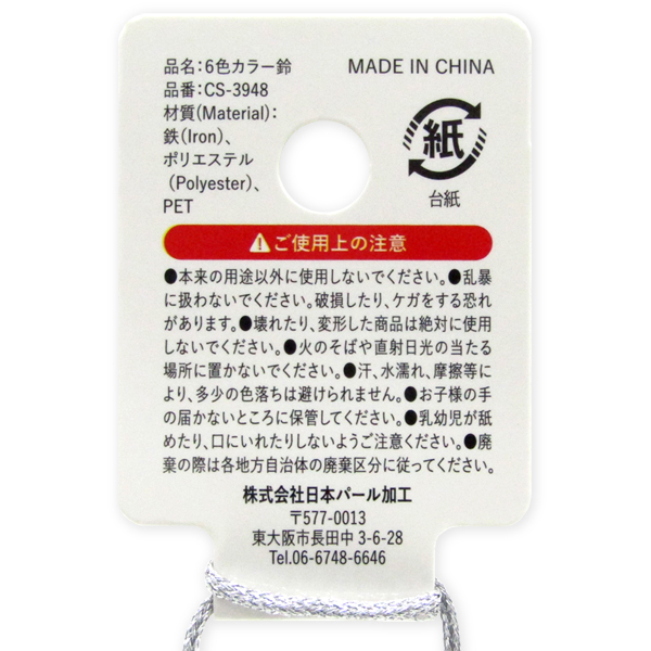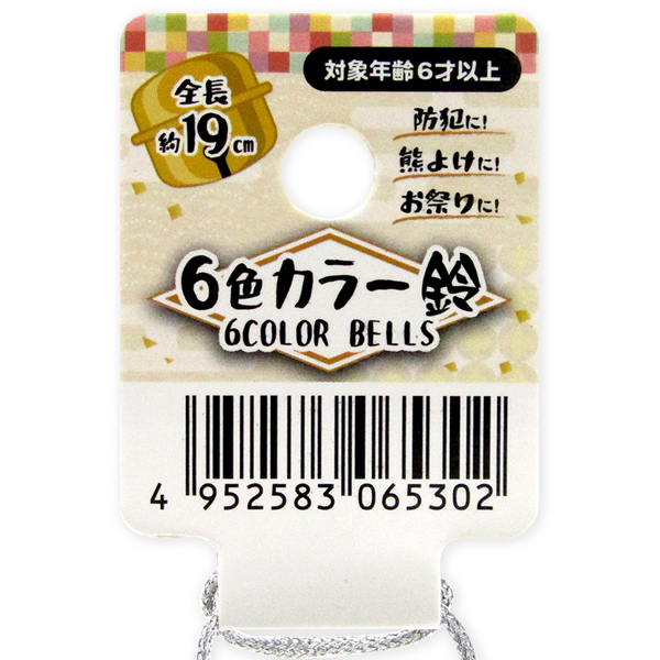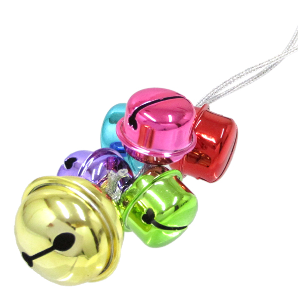 直径約3cmの鈴が1個、直径約2.1cmの鈴が5個付いたカラフルな鈴です。