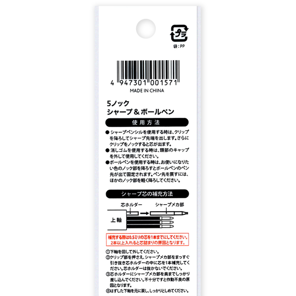 シャープペン(芯径0.5mm)+油性ボールペン(黒1.0mm/0.8mm、赤・青各0.8mm)