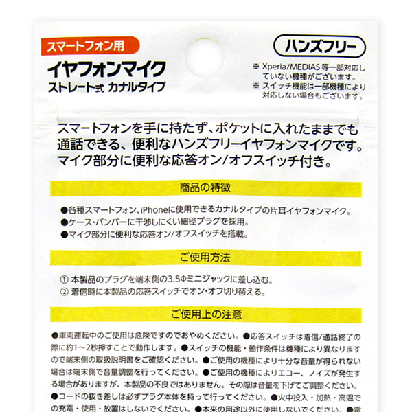スマートフォンを手に持たず、ポケット等に入れたままでも通話できるハンズフリーイヤフォンマイクです。